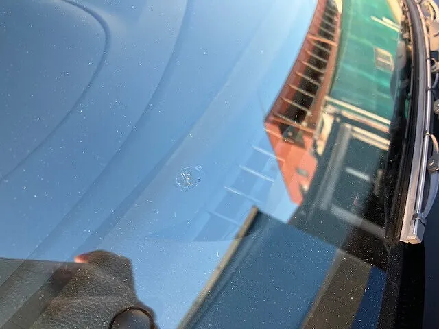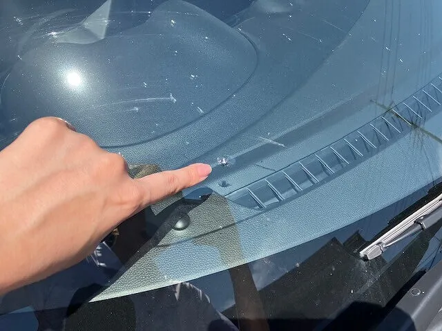 確認すると、ガラスの下部に直径5mmほどの飛び石キズを発見。