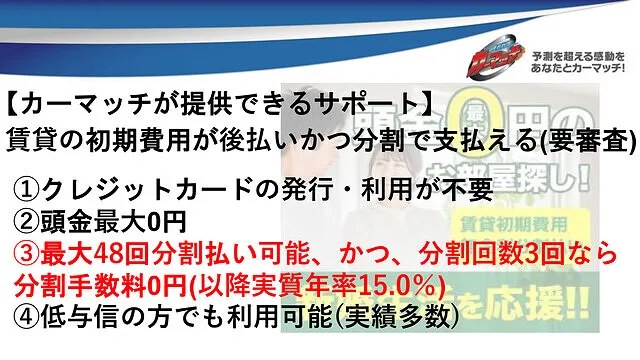 …そんな方にカーマッチでは賃貸物件の初期費用を分割払いできるサービスをご用意しております(要審査)。