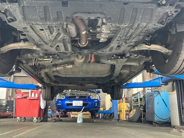 車体をリフトアップし、まずは下回りの総合点検からスタート。