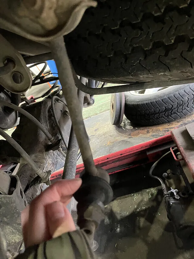 その結果、写真のようにリアスタビライザーリンクのブーツが破れており、内部のボールジョイントにガタが発生していることが確認できました。